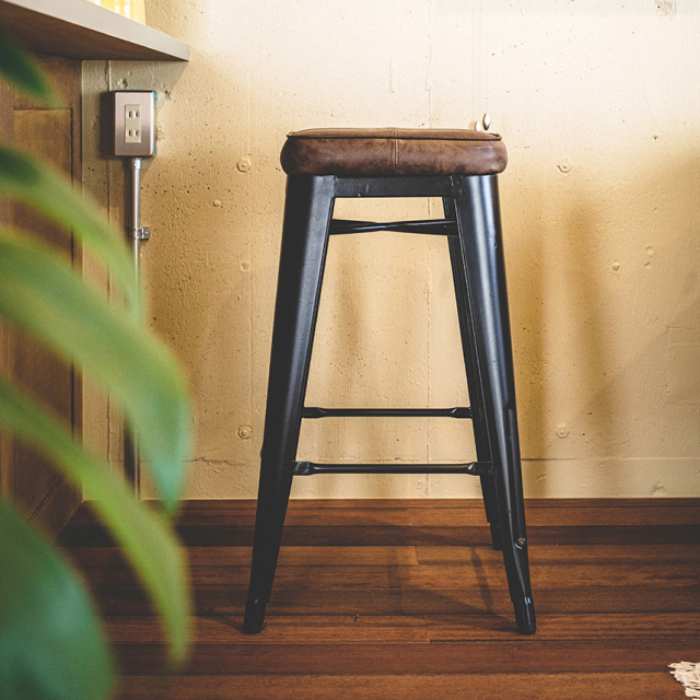 インダストリアルなテイストのハイスツール。スタッキングが可能なので、ゲスト用にストックしても◎