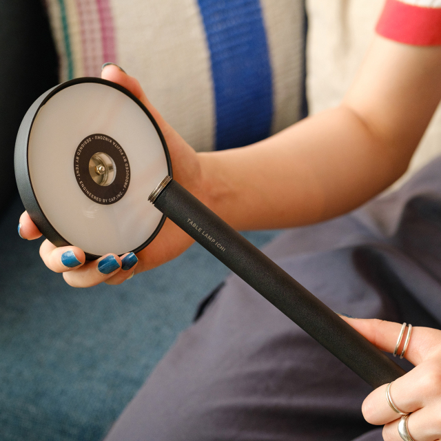 ダイニングテーブルやバルコニーなど、好きな場所で作業をするために、気軽に持ち運べる照明を作りたい!という思いから出来上がったテーブルランプ「イチ」。