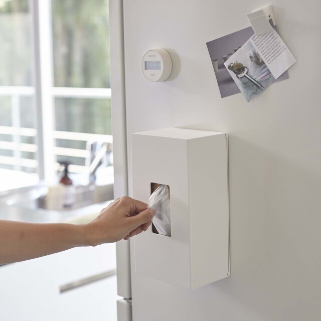 マグネットで取り付けたまま前から蓋が開けられる、キッチン整理に便利なボックスホルダーです。
