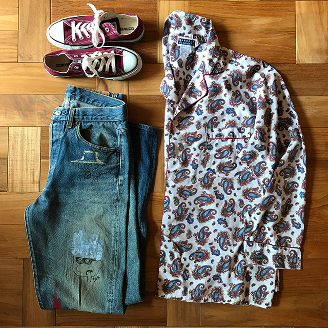 ユニセックスなアイテムですが、女性がゆったり着るのがおススメ。 【ペイズリー柄パジャマシャツ】6912yenはこちら 【uno yoshihiko ART Levis501 クラッシュペイントデニム W31 L36】13,000yenはこちら
