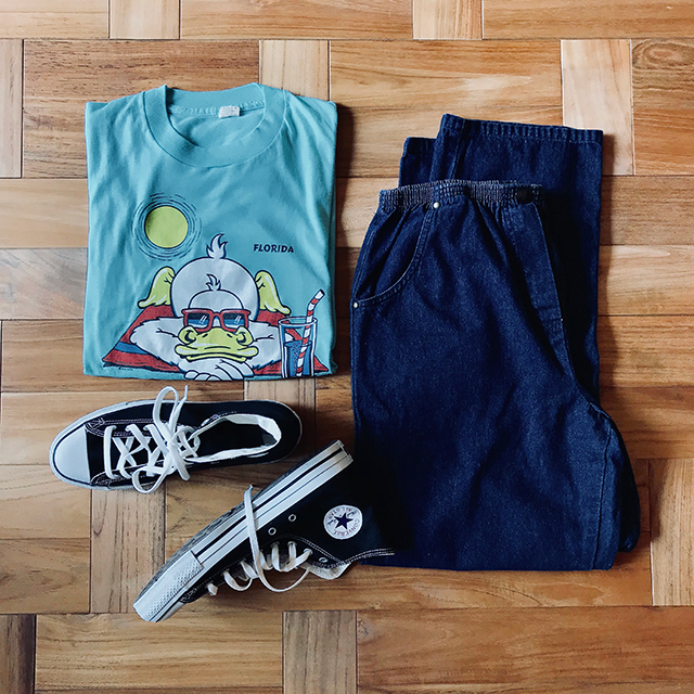 鮮やかなライトブルーのTシャツが涼しげな夏コーデ。 【Sunny duck Tシャツ 】4968yenはこちら 【デニムイージーパンツ】5832yenはこちら