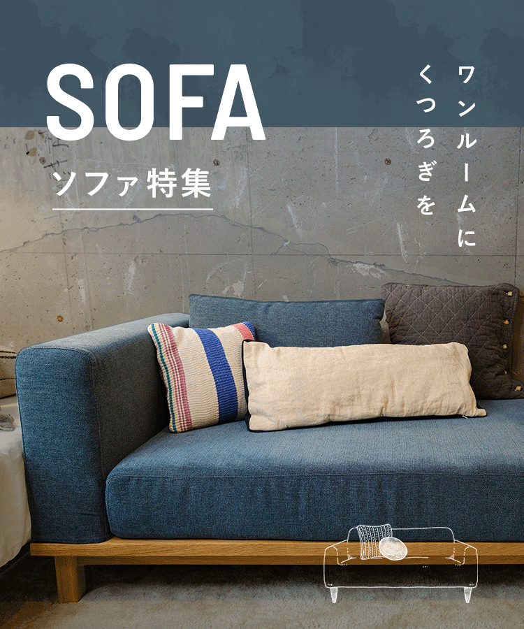 ワンルームのあなたに、一番おすすめしたいのは、脚なしor脚つきのロータイプ。圧迫感を感じづらく、ワンルームでも広く見せることができます。1人掛けのソファを組み合わせて2人掛けとして使えば、気分によって模様替えもできちゃいますよ。コーヒーテーブルとの相性もバッチリです。