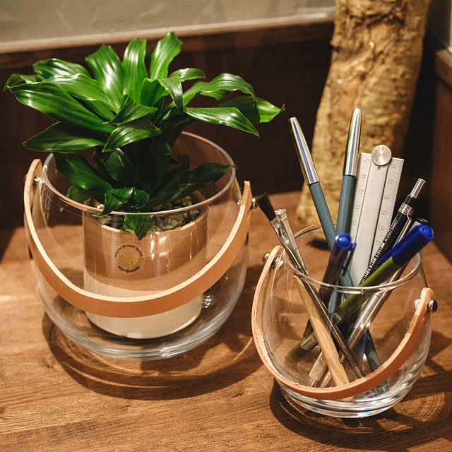 丸っこいフォルムとレザーの持ち手がカワイイマルチポット。 持ち手がレザーだとお手入れが大変そうだと思ったけれど、取り外しできるなんて優秀! デスク周りの散らばりがちな小物たちも、入れ物が可愛ければそれっぽく見える気がする。 洗面所周りのアイテムをまとめるのにも良さそうです。